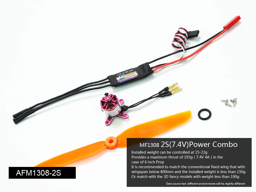 2S(7.4V) power combo is recommended to match the conventional fixed wing that with wingspan below 800mm and the flying weight is less than 230g. Or match with the 3D fancy models with flying weight less than 190g.