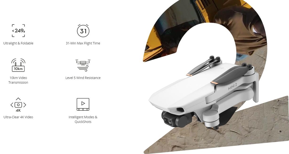 -ãOCUSYNC 2.0 VIDEO TRANSMISSIONã: Mini 2 supports up to 10km of HD video transmission and has excellent anti-interference capabilities, giving you the ability to fly farther and see clearer.