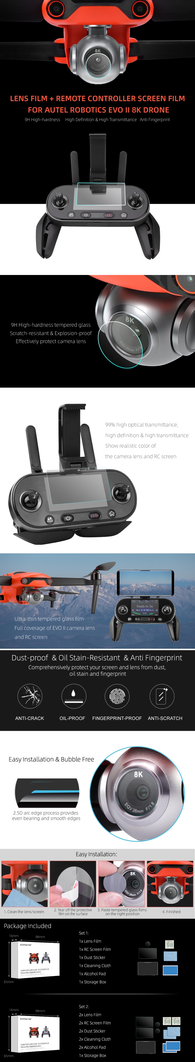 - Set 2: Lens Film(2pcs) + Remote Controller Screen Film(2pcs) Set