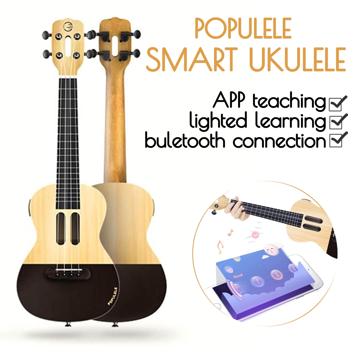 -Special ABS fretboard designed with LED lights showing the play locations, you can follow the light to play the ukulele, easy and quick learning.